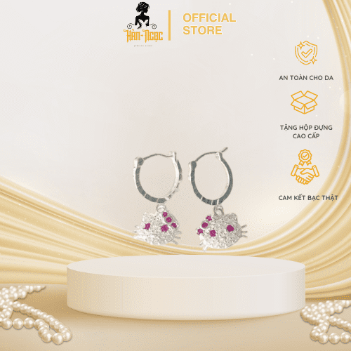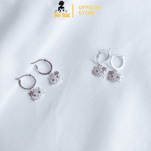 Lấy cảm hứng từ nhân vật Kitty đáng yêu, đôi bông tai được điểm xuyết thêm những viên đá hồng tím nổi bật. Kiểu dáng tùng teng nhẹ nhàng tạo hiệu ứng uyển chuyển khi di chuyển, mang đến nét duyên dáng đầy nữ tính. Thiết kế phù hợp với nhiều phong cách, từ đơn giản đến dễ thương.